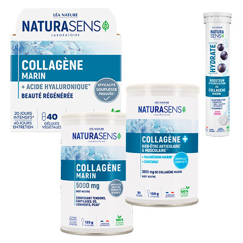 Le collagène constitue tendons, cartilages, os & peau. Voici la gamme Collagène marin Naturasens : la haute exigence à prix accessible !