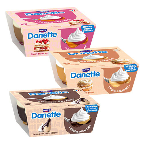 Danette liégeois pâtissier est une nouvelle gamme gourmande qui revisite tes desserts préférés. Parce que “jamais deux sans trois”, Danette a fait de délicieuses associations de saveurs en 3 couches rien que pour toi : un coulis savoureux, une crème dessert onctueuse, et une chantilly généreuse. À découvrir au rayon frais en 4 recettes emblématiques : façon Paris-Brest, Tiramisu, Poire Belle-Hélène et Framboisier.